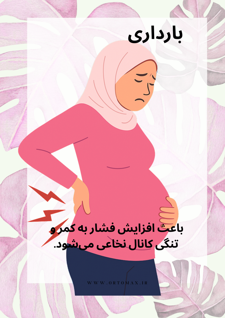 در دوران بارداری به دلیل تغییرات هورمونی و افزایش وزن، فشار بیشتری به ستون فقرات وارد میشود و در برخی موارد علائم تنگی کانال کمری تشدید میشود.