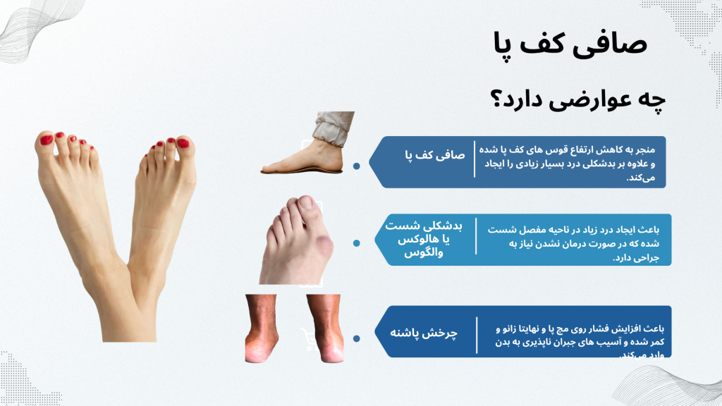 علائم: درد در قوس پا، زانو یا کمر، خستگی هنگام ایستادن طولانی، تغییر حالت کفشها.